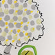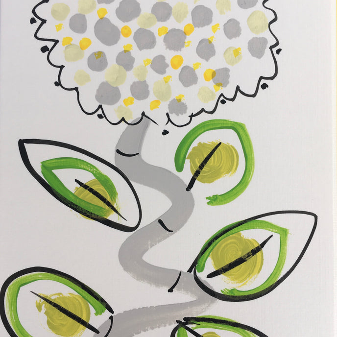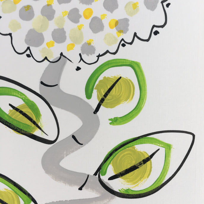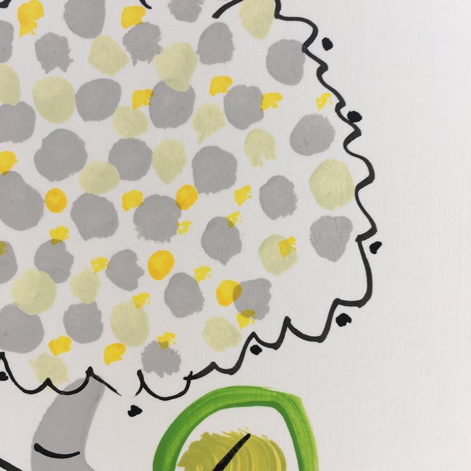 Hand painted with Gouache on a heavy weight water colour paper.. yellow, grey & green with a yellow envelope and a cellphone wrapper.