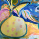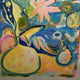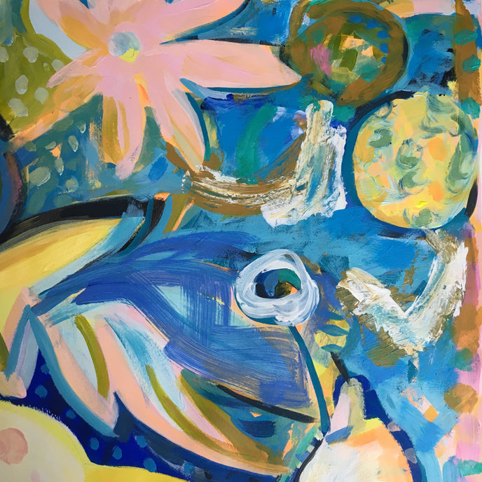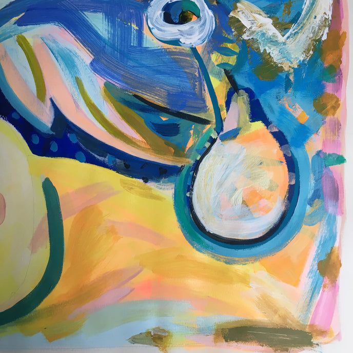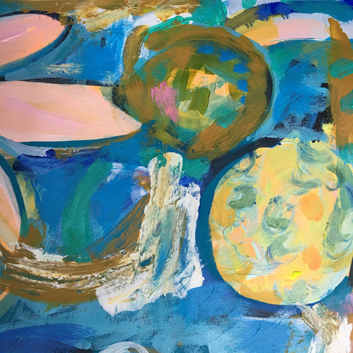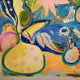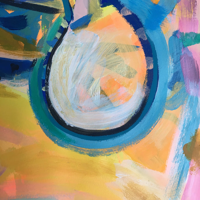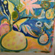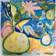Original painting on a heavy weight textured paper. Gouache and water colours. 52 x 52 cm square. Vibrant palette of oranges, yellows and a painterly border.