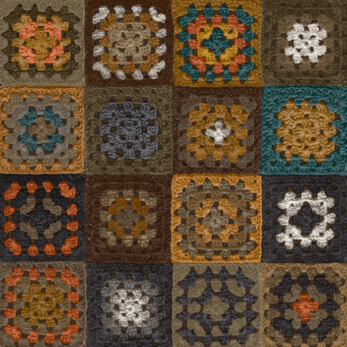 Granny Square Wallpaper - Various crocheted square patterns, this image shows a full repeat that is 52 cm square which contains 16 different squares