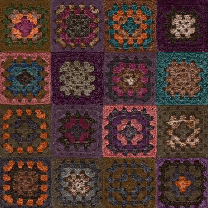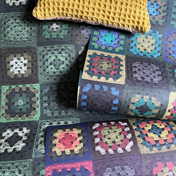 Granny Square Wallpaper - Various crocheted square patterns, this image shows a full repeat that is 52 cm square which contains 16 different squares