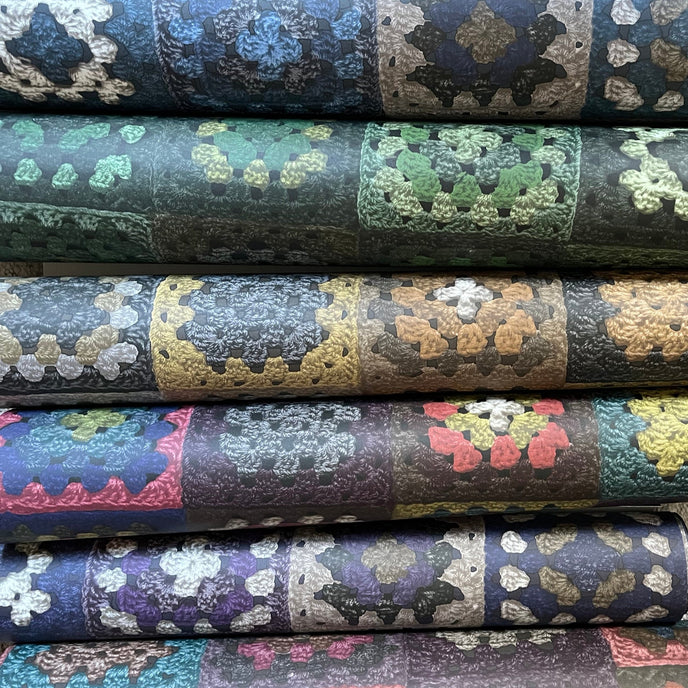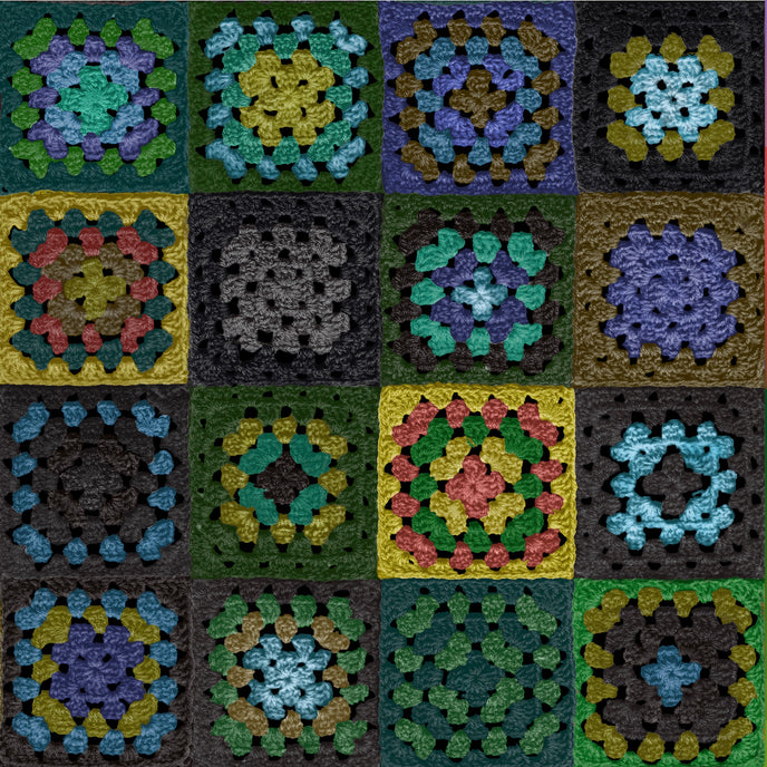 Granny Square Wallpaper - Various crocheted square patterns, this image shows a full repeat that is 52 cm square which contains 16 different squares