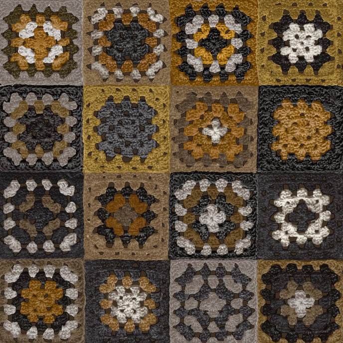 Granny Square Wallpaper - Various crocheted square patterns, this image shows a full repeat that is 52 cm square which contains 16 different squares