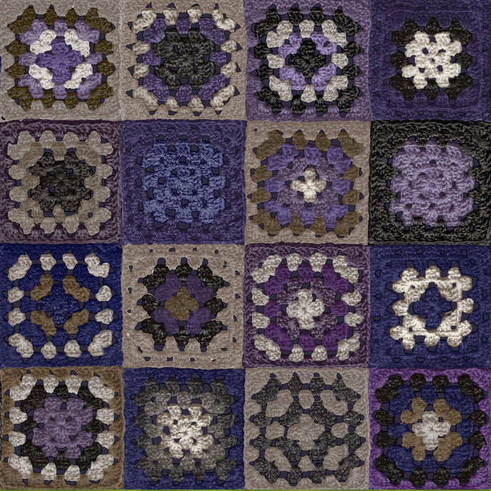 Granny Square Wallpaper - Various crocheted square patterns, this image shows a full repeat that is 52 cm square which contains 16 different squares