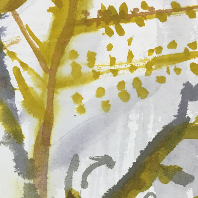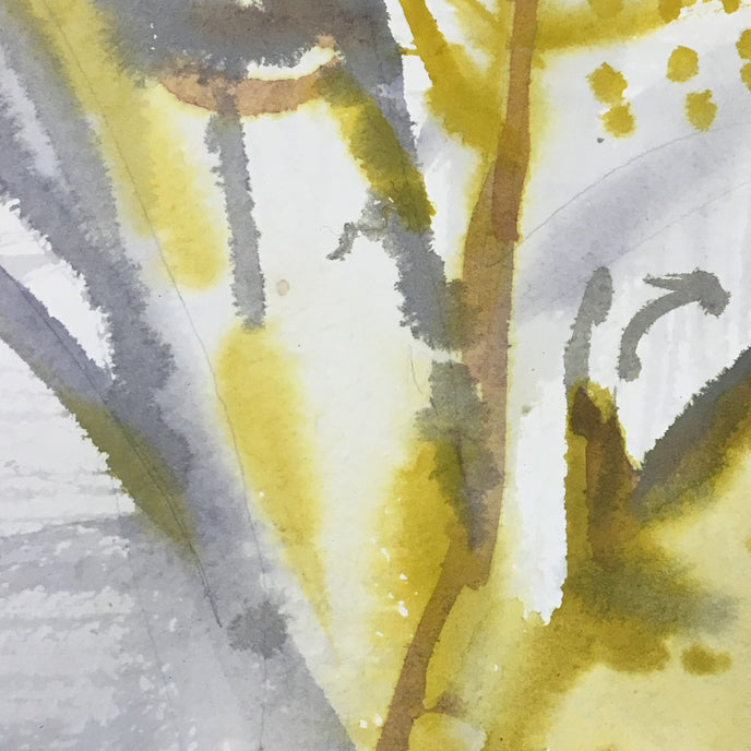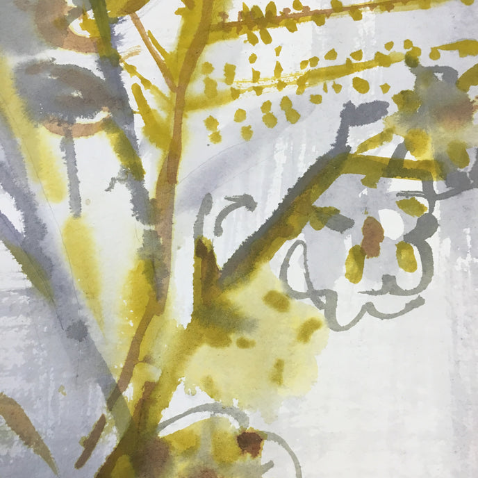 Ferns watercolour painting using inks and watercolours on a heavy weight textured khadi paper. Burnt umber and ochre tones with flashes of grey.