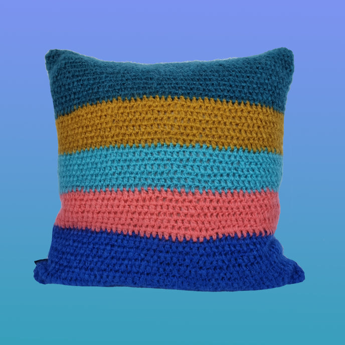 Hand crocheted cushion cover, backed in beige linen fabric. only one available.