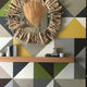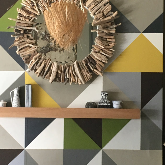 Hand printed wallpaper. Flat tonal coloured large scale triangles. Tonal blues/greys plus corals/greys. Painterly, subtle brush marks.