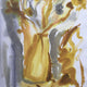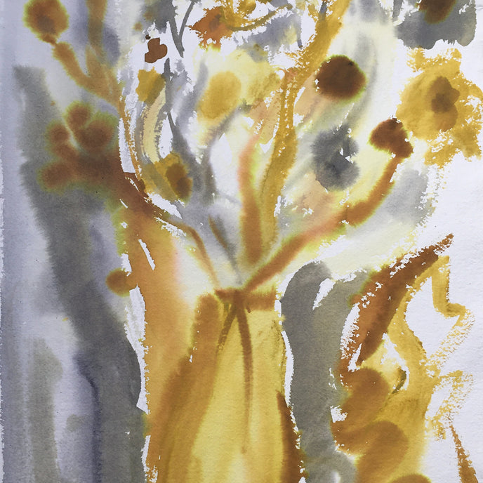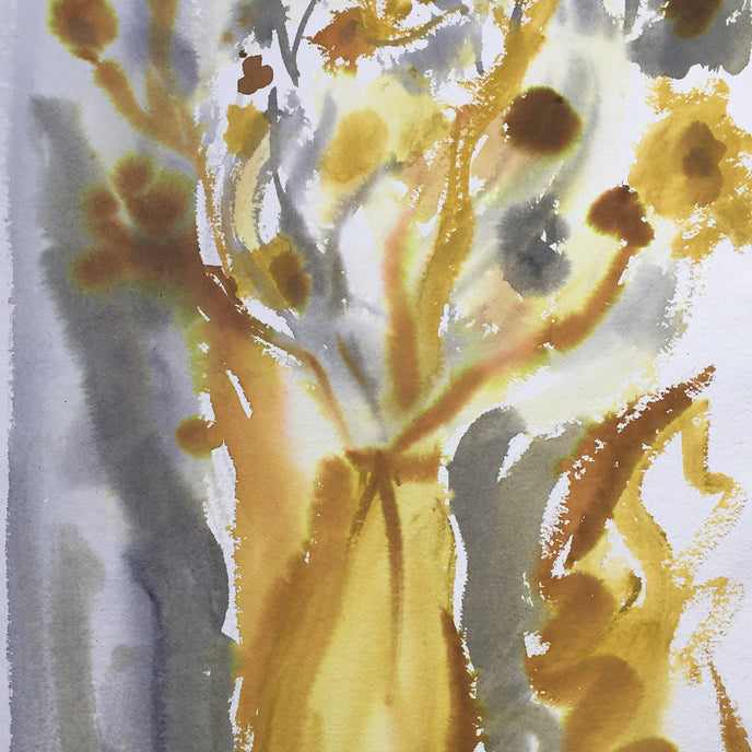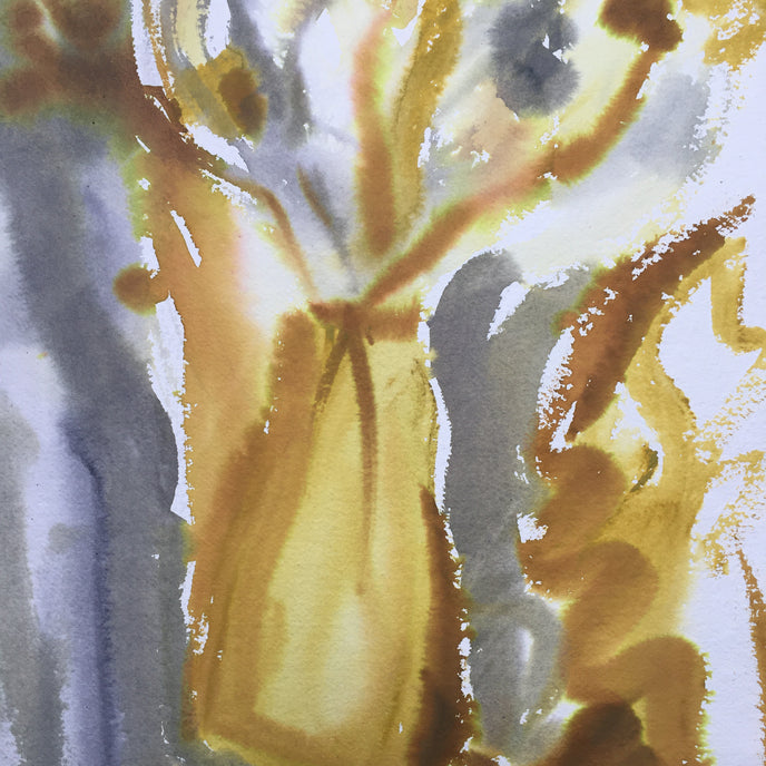 Watercolour painting on a heavy weight textured khadi paper. Burnt umber and ochre tones with flashes of grey.