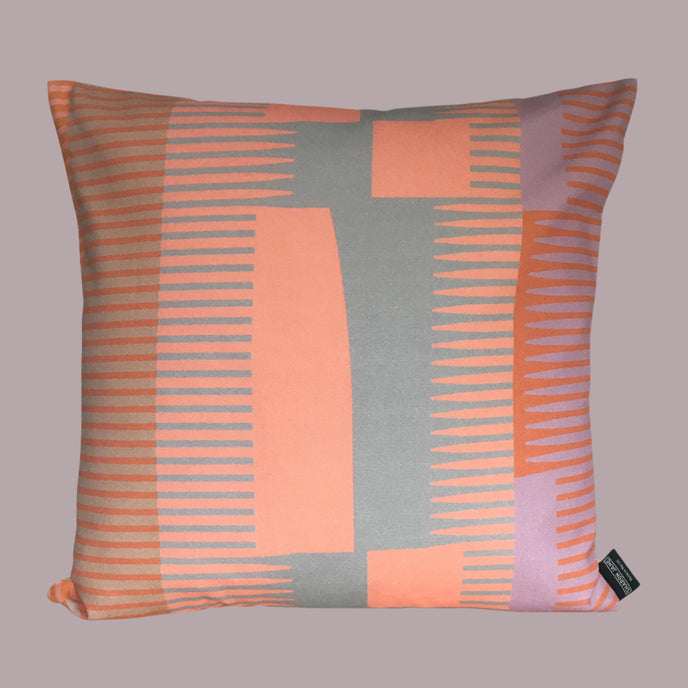 Printed cotton Panama front and neutral linen plain back. filled feather inner.Zipped fastening.