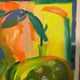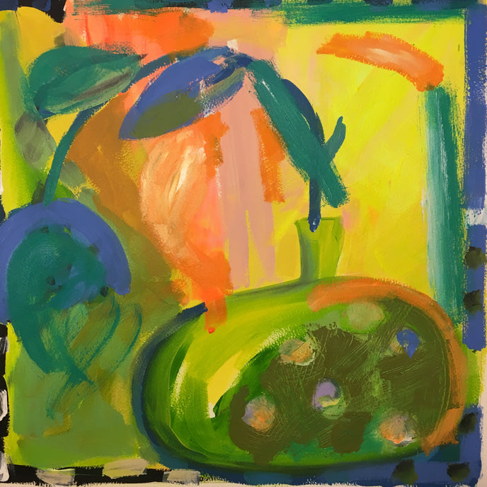 Original painting on a heavy weight textured paper. Gouache and water colours. 52 x 52 cm square. Vibrant palette of oranges, yellows and a painterly monochrome border.